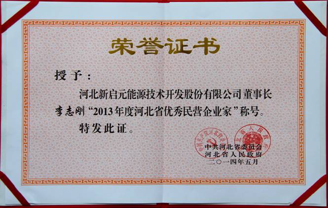 6月5日,中共河北省委、河北省人民政府授予新啟元公司“河北省2013年度百強(qiáng)民營企業(yè)”榮譽(yù)稱號。授予新啟元公司董事長李志剛“2013年度河北省優(yōu)秀民營企業(yè)家”榮譽(yù)稱號。