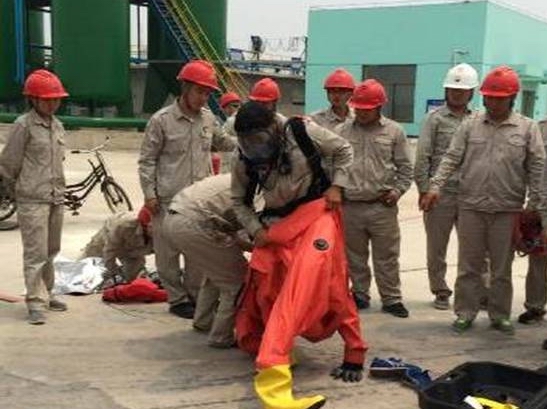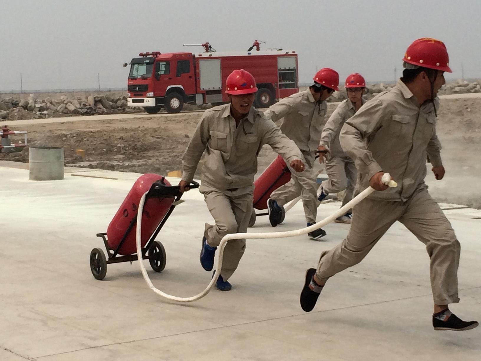 比賽共設(shè)三個(gè)項(xiàng)目:滅火器使用比賽、消防水帶使用比賽、空氣呼吸器及防化服穿戴比賽。健康安全環(huán)保部經(jīng)理孫長(zhǎng)輝任總指揮,公司副總經(jīng)理劉立新現(xiàn)場(chǎng)指導(dǎo),中捷安監(jiān)局科長(zhǎng)宋魁作為嘉賓也來到了現(xiàn)場(chǎng)。
