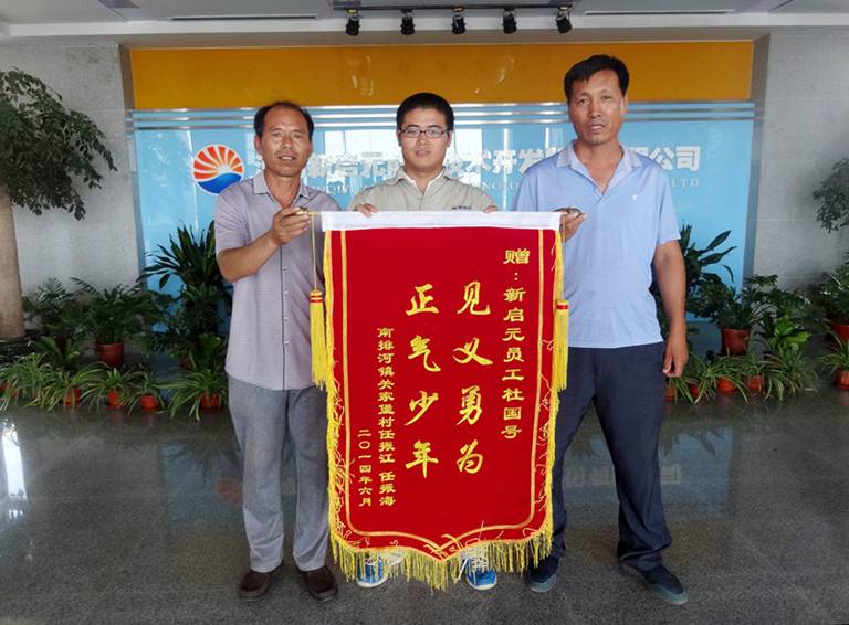 7月15日,在車禍中被救人員家屬來到新啟元公司,向見義勇為的員工杜國號贈送錦旗表示感謝,這是他繼去年救助一名落水老人之后的又一善舉。