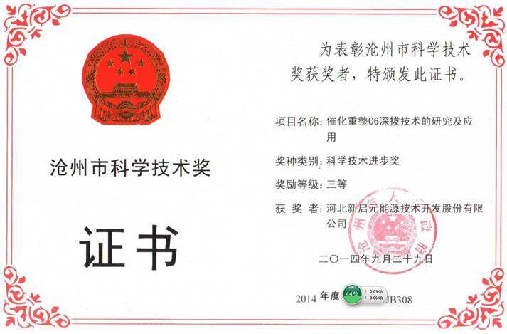 2014年10月13日河北新啟元能源技術(shù)開發(fā)股份有限公司獲得滄州市科學(xué)技術(shù)獎(jiǎng)三等獎(jiǎng),獲獎(jiǎng)項(xiàng)目為《催化重整C6深拔技術(shù)的研究及應(yīng)用》。項(xiàng)目主要完成人李志剛、喬樹華、劉海軍、劉立新、鄭擁軍。