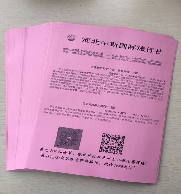 春季正是花開柳綠、服裝換季的季節(jié),旅行社全體成員談?dòng)懷芯?,在三月份每周推出特價(jià)旅游團(tuán),北京玉淵潭公園賞櫻花一日游,天津佛羅倫薩小鎮(zhèn)、楊柳青古鎮(zhèn)休息購(gòu)物一日游,為黃驊、中捷百姓提供一個(gè)踏青賞花、游、購(gòu)、娛的服務(wù)平臺(tái)。
