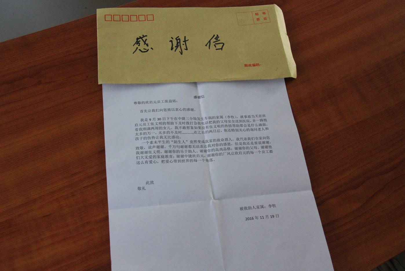救護(hù)車到來(lái)后,張益銘與醫(yī)護(hù)人員將兩位老人和孩子抬上車趕往醫(yī)院。到醫(yī)院后,他推著兩位老人做各項(xiàng)檢查,并墊付醫(yī)藥費(fèi),一直等到家屬的到來(lái)。由于下午還需要上班,和交警、家屬介紹完事故過(guò)程及大概受傷情況后他離開(kāi)了醫(yī)院,事后沒(méi)和任何人提起,直到被救人員家屬送來(lái)錦旗和感謝信的那一刻。張益銘說(shuō):“在救人過(guò)程中沒(méi)耽誤時(shí)間是我最欣慰的”。