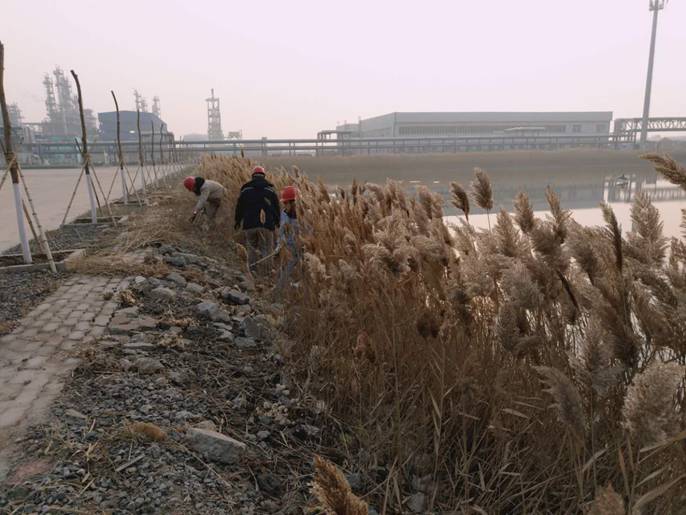 細(xì)問之下了解到,原來是運(yùn)行六部的尾氣硫酸銨二班、水廠二班、污水二班的員工們看到景觀湖周圍干枯的蘆葦影響了公司整體環(huán)境的美觀,同時面臨氣候干燥的冬季容易成為火災(zāi)隱患。為此,班長們主動溝通交流,利用休班時間自動自發(fā)的對景觀湖蘆葦進(jìn)行清理。