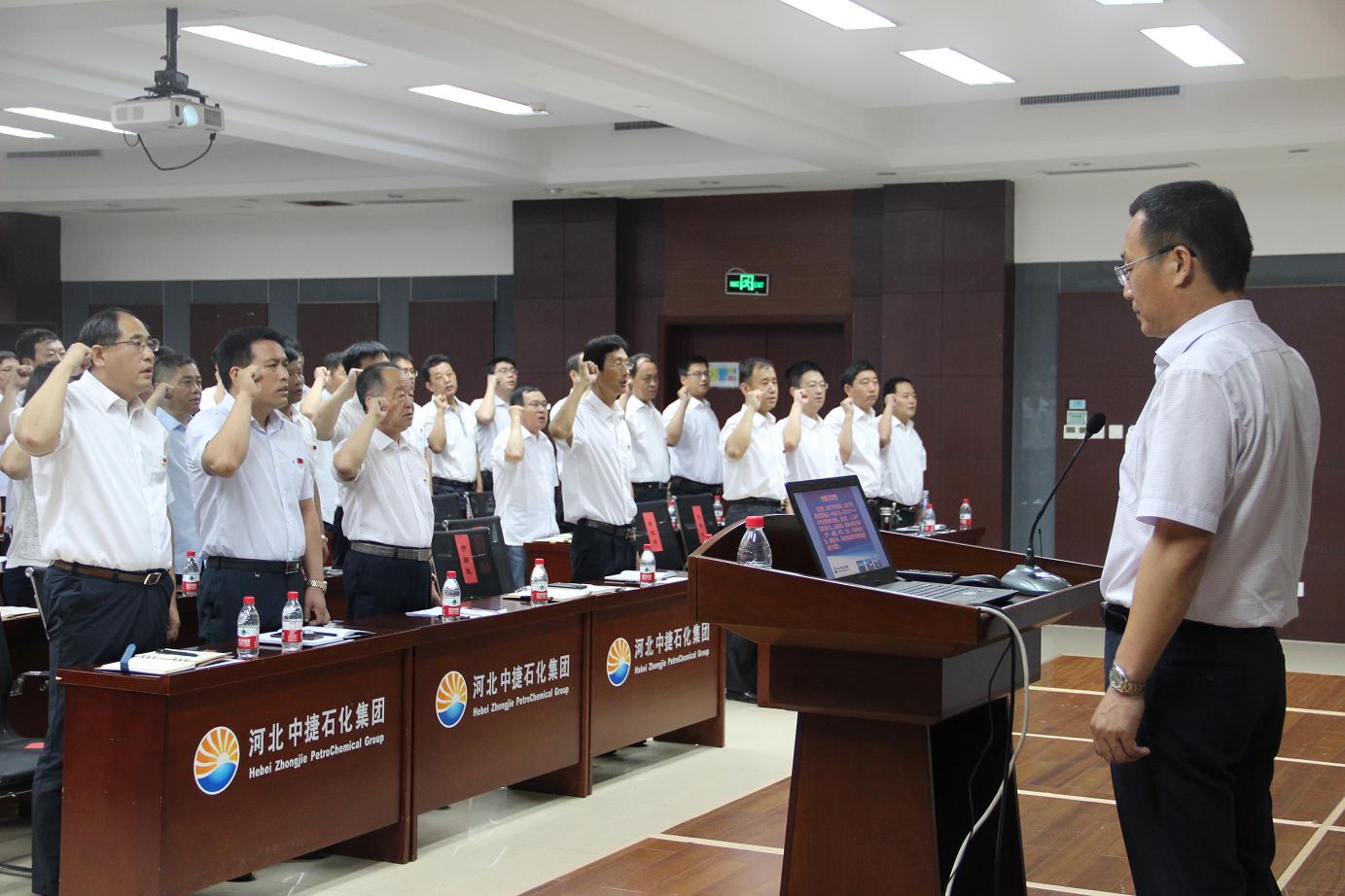 我宣誓:忠實(shí)于我的祖國,忠實(shí)于祖國的重要組成——中捷石化——蒼天之下一個(gè)不可分割的偉大團(tuán)隊(duì)。在這里,人人享有真實(shí)和正義。從現(xiàn)在起,我決心每日做到:生產(chǎn)、創(chuàng)造、學(xué)習(xí)、成長,并且學(xué)會(huì)分擔(dān),懂得分享,以熱情和愛抒寫激情燃燒的歲月篇章。伴隨著鏗鏘有力的宣誓聲,整個(gè)會(huì)議在集團(tuán)公司于總的領(lǐng)誓下拉開序幕。
