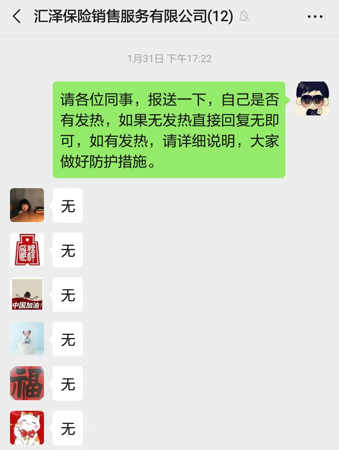 隨著防疫工作的深入,黨支部把收集單位員工信息、活動范圍、體溫檢測作為重要環(huán)節(jié)?,F(xiàn)在匯澤保險銷售服務有限公司全體員工自發(fā)加入到防控隊伍中,筑起了防控疫情的鐵壁銅墻。匯澤保險黨支部在落實防疫工作的同時,在公司群和支部群中時時發(fā)送疫情期間個人居家和復工防護要點,重點關注廣大員工身體健康和生命安全。