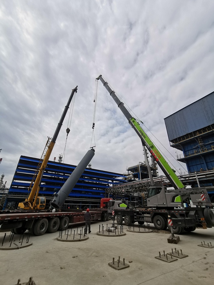 3月31日上午9時,伴隨著指揮人員的一聲哨響,“吸附塔”在兩臺吊車的默契配合下平穩(wěn)起升,回轉(zhuǎn)、直立、就位一系列動作嫻熟準(zhǔn)確,8臺“吸附塔”在2天內(nèi)相繼完成吊裝,順利完成了該項目建設(shè)的關(guān)鍵節(jié)點(diǎn)。此項目建成后可回收氫氣5500Nm3/h,為加氫裝置用氫提供保障。