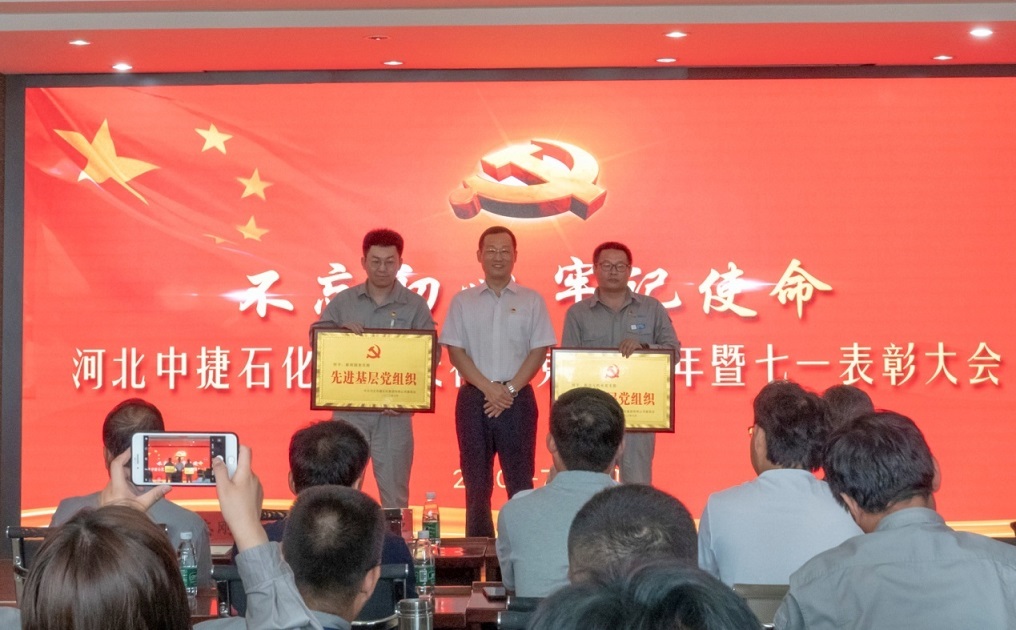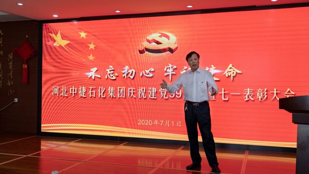 集團(tuán)公司訊(通訊員 朱鑫林)為熱烈慶祝和紀(jì)念中國(guó)共產(chǎn)黨成立99周年,表彰一批在黨建和集團(tuán)事業(yè)發(fā)展建設(shè)中涌現(xiàn)出來的先進(jìn)基層黨組織、優(yōu)秀黨務(wù)工作者、優(yōu)秀共產(chǎn)黨員,勉勵(lì)廣大黨員不忘初心,牢記使命,繼承和發(fā)揚(yáng)黨的優(yōu)良傳統(tǒng),7月1日,河北中捷石化集團(tuán)黨委組織召開了慶祝建黨99周年暨“七一”表彰大會(huì)。原中捷企業(yè)黨工委書記沈?qū)W明同志,集團(tuán)黨委書記于國(guó)臣同志,集團(tuán)總經(jīng)理喬樹華同志,以及各所屬黨支部書記,各所屬單位董事長(zhǎng)、總經(jīng)理,2019-2020年度先進(jìn)基層黨組織代表、優(yōu)秀黨務(wù)工作者、優(yōu)秀共產(chǎn)黨員,各支部黨員代表共計(jì)70余人參加了此次活動(dòng)。