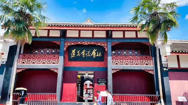 駐足遵義會議紀(jì)念館,首先映入大家眼簾的是紀(jì)念館門前大門正上方掛著的一塊黑漆金匾,上面有毛主席親自題寫的“遵義會議會址”6個(gè)金光閃閃的大字,字跡飄逸豪放。遵義會議紀(jì)念館的展廳內(nèi)展示了大量文物、珍貴歷史圖片、文獻(xiàn)資料等,生動(dòng)地再現(xiàn)了紅軍長征的歷程?!伴L征精神誨育千秋,遵義會議永放光芒?!弊窳x會議集中體現(xiàn)了堅(jiān)定信念、實(shí)事求是、獨(dú)立自主、敢創(chuàng)新路、民主團(tuán)結(jié)的精神。