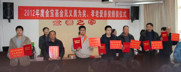 2012年12月12日下午,在金寶商城六樓培訓(xùn)室內(nèi),舉行了2012年度金寶基金見義勇為獎、孝老愛親獎頒獎儀式,表彰了跳入臭水坑中勇救落水老人的新啟元員工杜國號等7名“見義勇為先進(jìn)個人”。在大家熱烈的掌聲中,黃驊市委常委、宣傳部長程秀珍、副市長陳增強、金寶公司總經(jīng)理趙金義、市文明辦主任等領(lǐng)導(dǎo)將榮譽證書和2000元的獎勵發(fā)到他們手中。